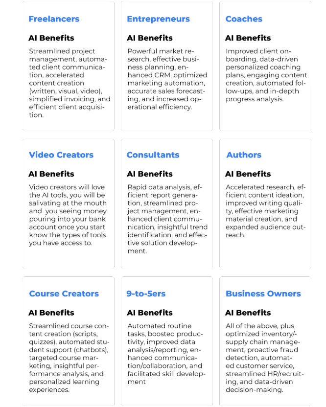 Stay Ahead With Monthly Updates: A new cutting-edge AI tool training is added to the members’ area every month, ensuring you’re always ahead of the curve.
